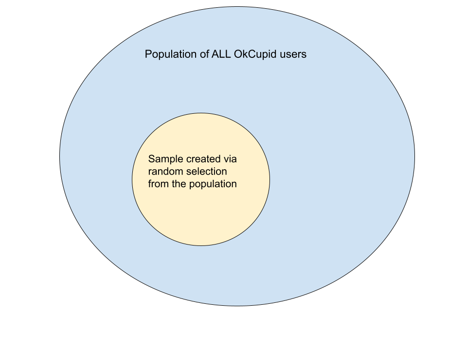 The p-value of a statistical test is the probability of obtaining a false positive result (i.e., a result that seems significant, but isn’t). To illustrate the concept, imagine you are a researcher analyzing this dataset of ~60 thousand OkCupid profiles.1 Let’s assume this is a representative sample of the population of all OkCupid users: