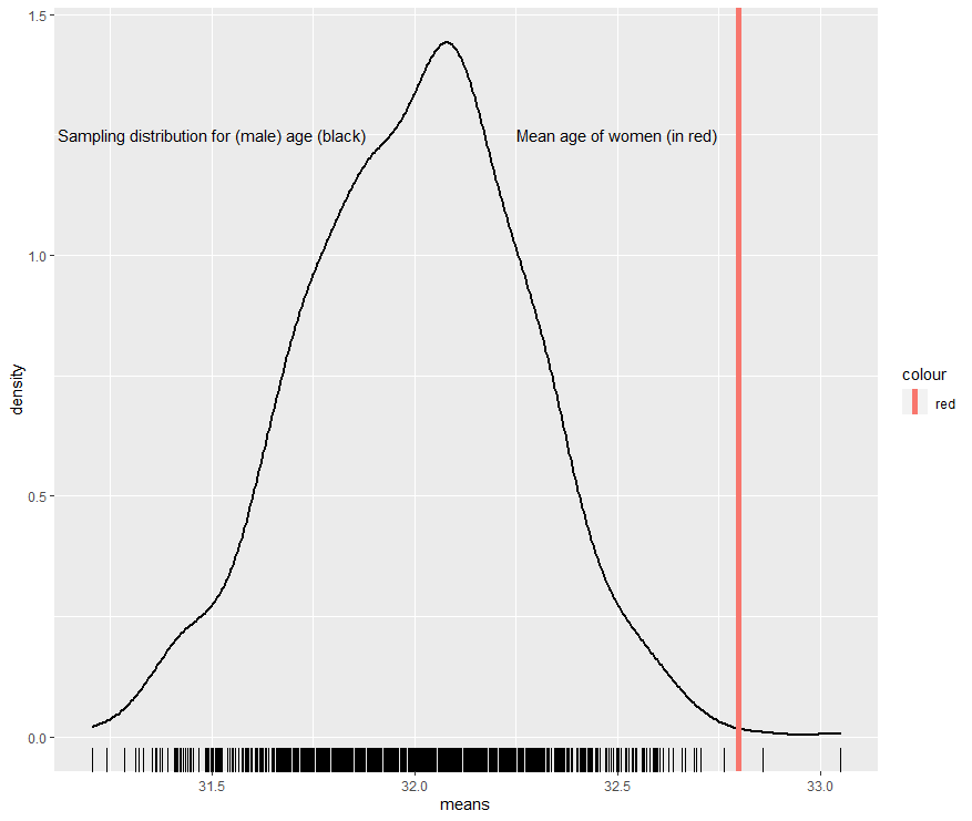 To determine whether to reject the null hypothesis, first imagine the average age of females is situated on the male sampling distribution (which is what we are saying with the null hypothesis). We then find the number of standard deviations the average age of females is from the center of the distribution.3 Here is where the mean age of females falls on the male sampling distribution:
