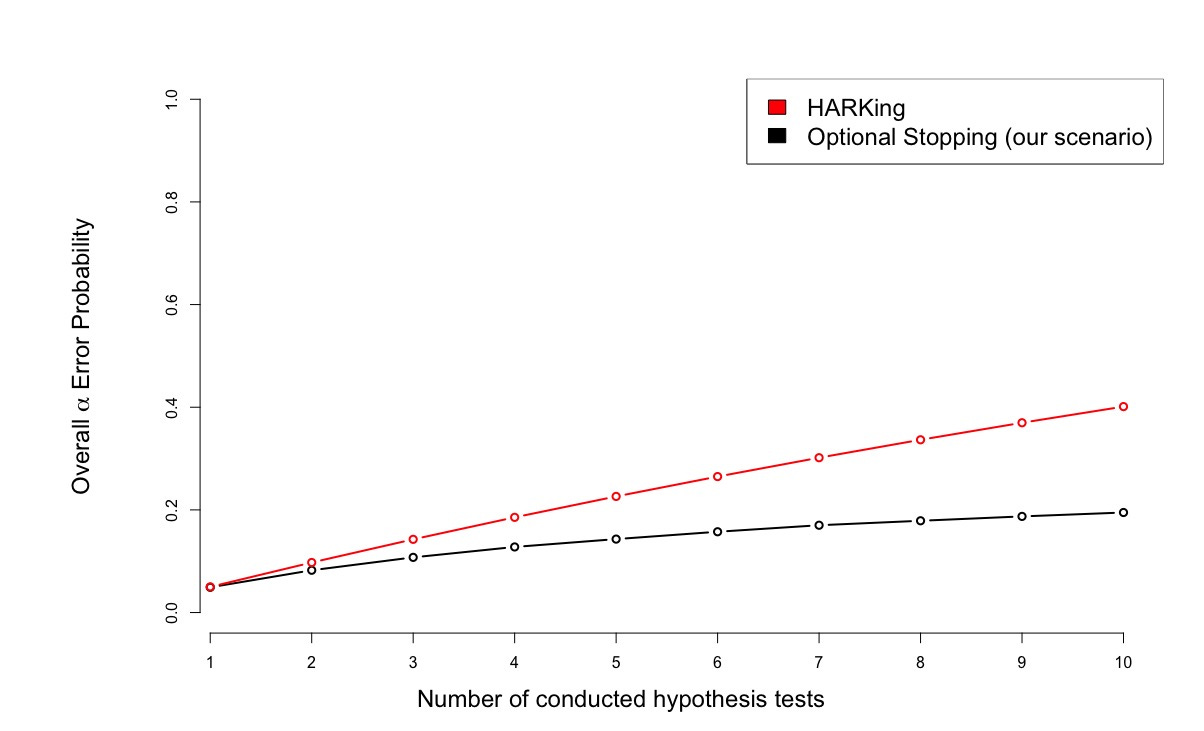 We can see that HARKing produces higher false positive rates than optional stopping with the same number of tests. This can be explained through the dependency on the first sample in the case of optional stopping: Given that the null hypothesis is true, this sample is not very likely to show extreme effects in any direction (however, there is a small probability that it does). Every extension of this sample has to “overcome” this property not only by being extreme in itself but also by being extreme enough to shift the test on the overall sample from non-significance to significance. In contrast, every sample in the multiple testing case only needs to be extreme in itself.