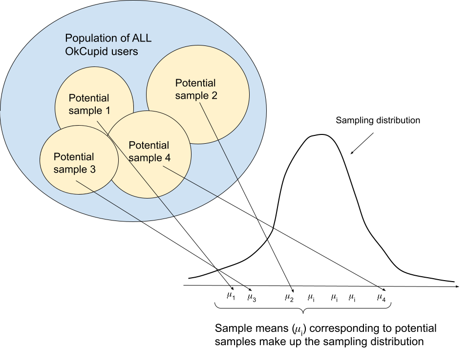 H_1: mean_age_male ≠ mean_age_femaleTo recap: we can think of the sample mean as falling somewhere on a theoretical distribution of all potential sample means called the sampling distribution. In case it helps, here’s a diagram I made (with the m-looking greek letter mu the sample mean for a given sample i (so, mu_1 corresponds to potential sample 1, mu_2 corresponds to potential sample 2, etc.).
